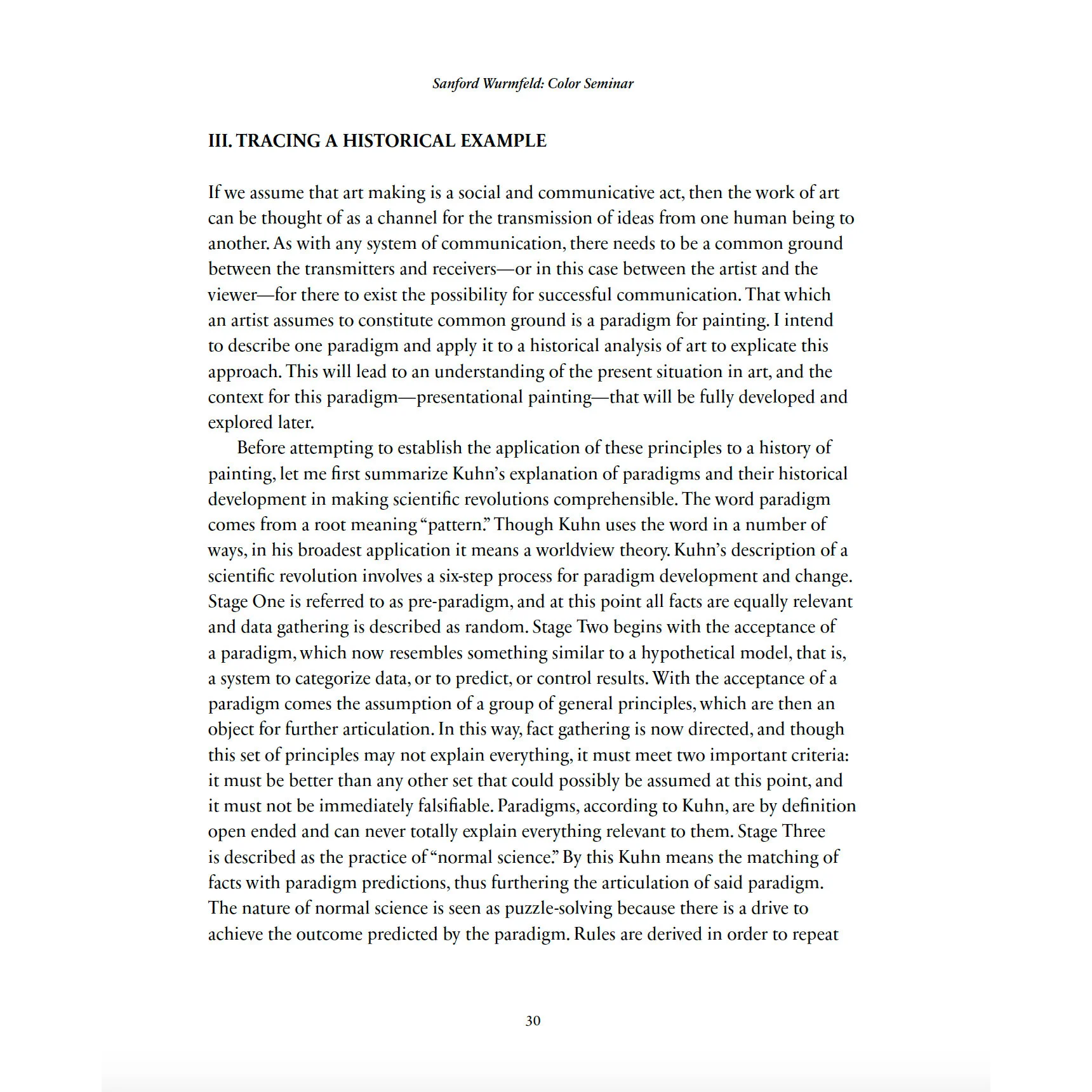 The Color Seminar was geared to both artists and art historians alike, and Wurmfeld taught it each semester for twenty-five years, with his last class taking place in the spring of 2012, the year he retired. All told, more than 500 individuals participated in his elective course, and its extensive and continuing impact on contemporary art discourse, and on abstract painting in particular, cannot be overstated. From studios to classrooms, former students, now established artists in their own right, have been teaching their own interpretations of this course for years now in visual arts and curatorial programs across the country.