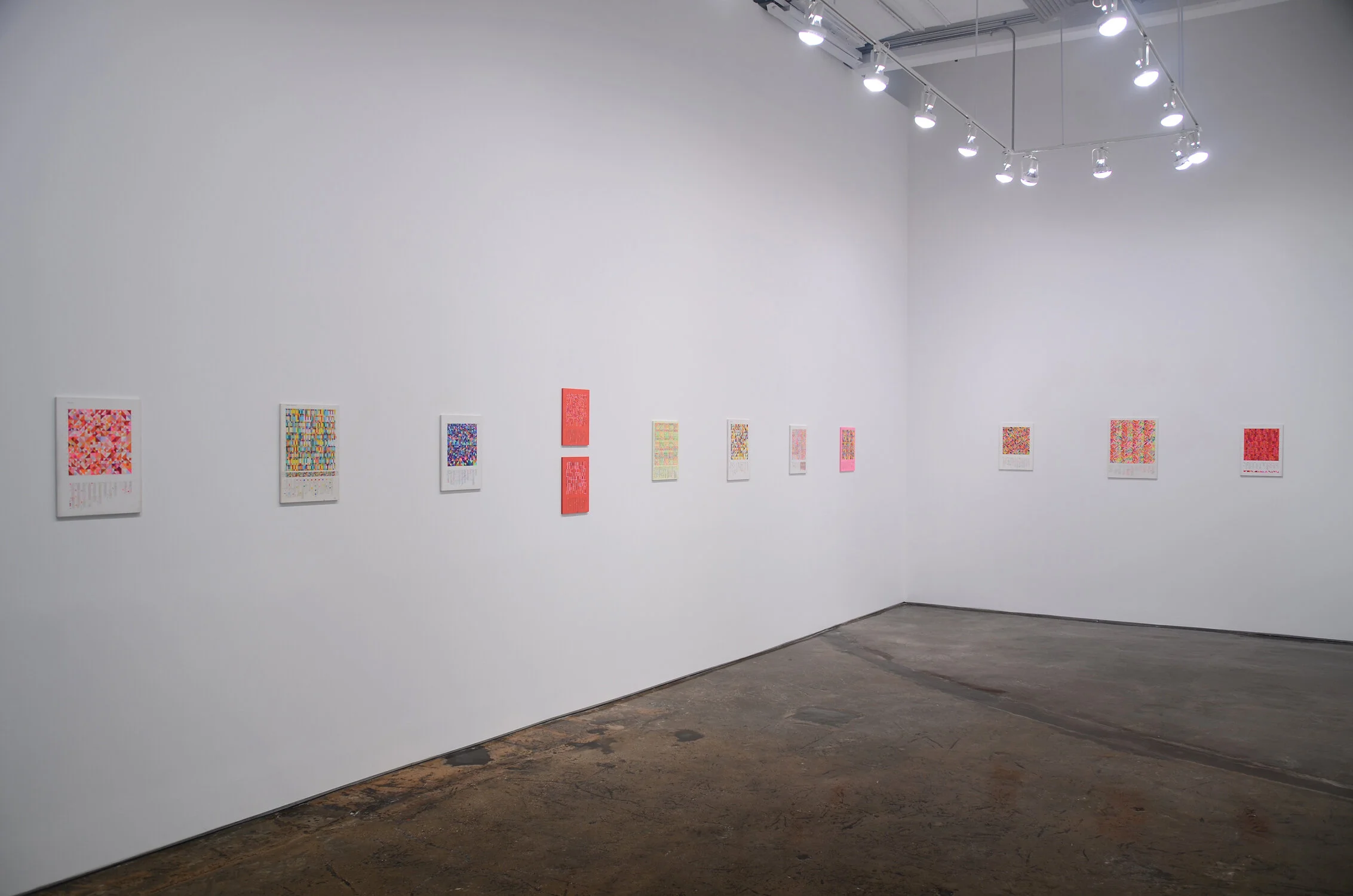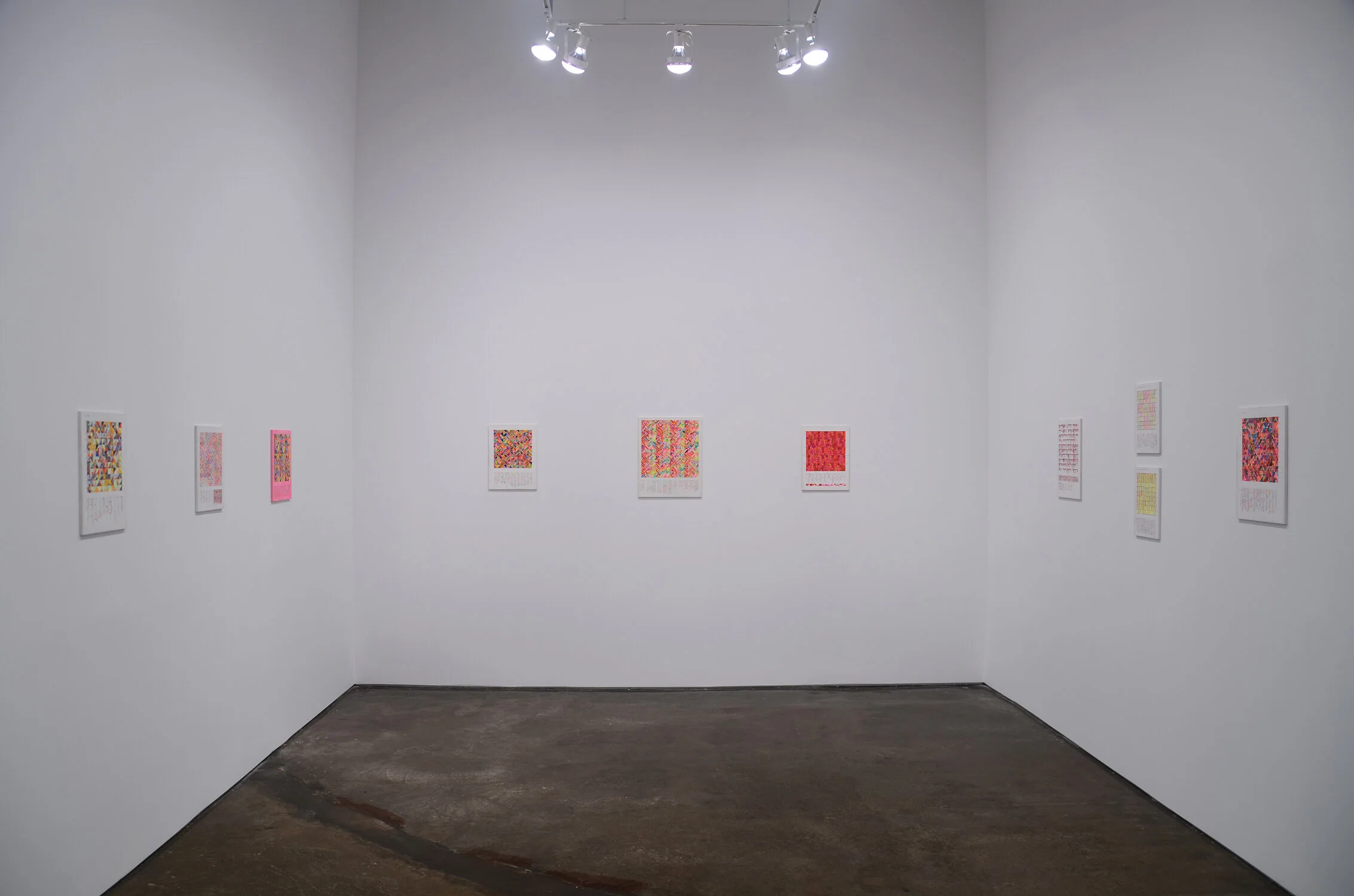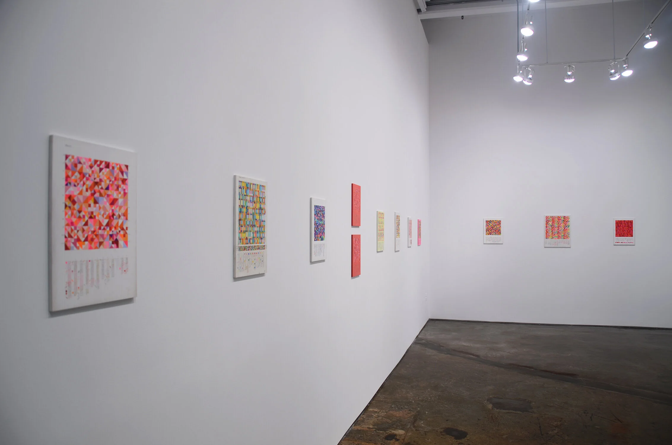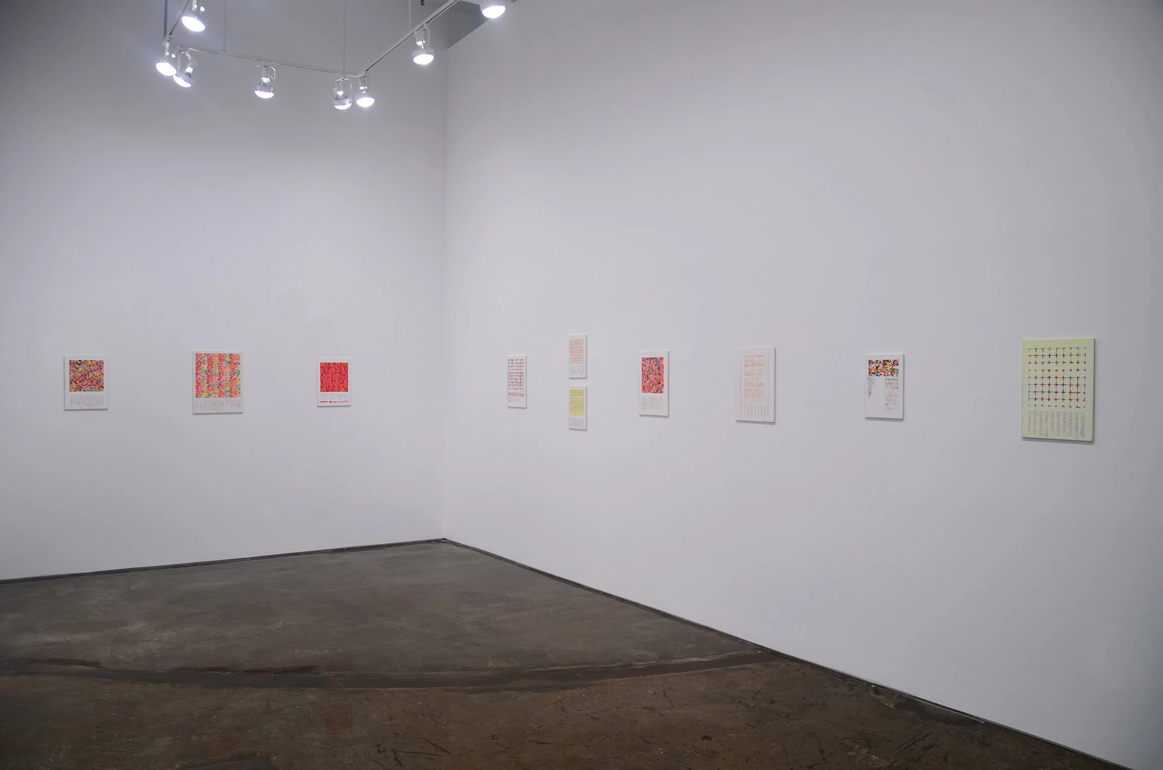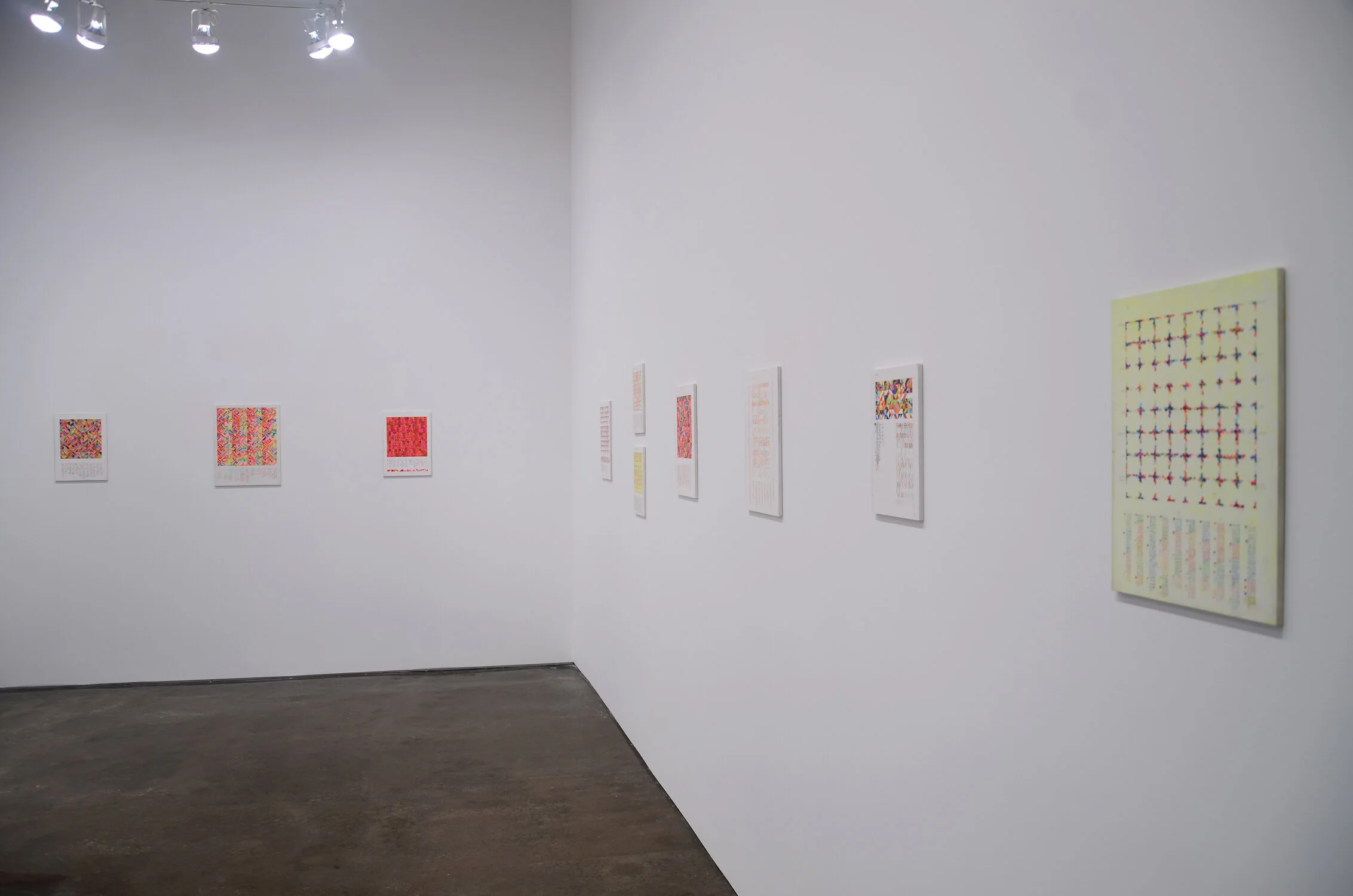 Working in acrylic gouache, ink, and pencil on slender, whitewashed panels, Roberts methodically, yet intuitively, assigns specific colors and forms to individual words. The words are then mapped out as lines and shapes onto gridded X and Y axes forming lush, wavering geometric configurations. In some paintings, the text is coded in multiple ways, resulting in layered systems yielding “crystalline structures, linear networks, and other abstract dialects.”